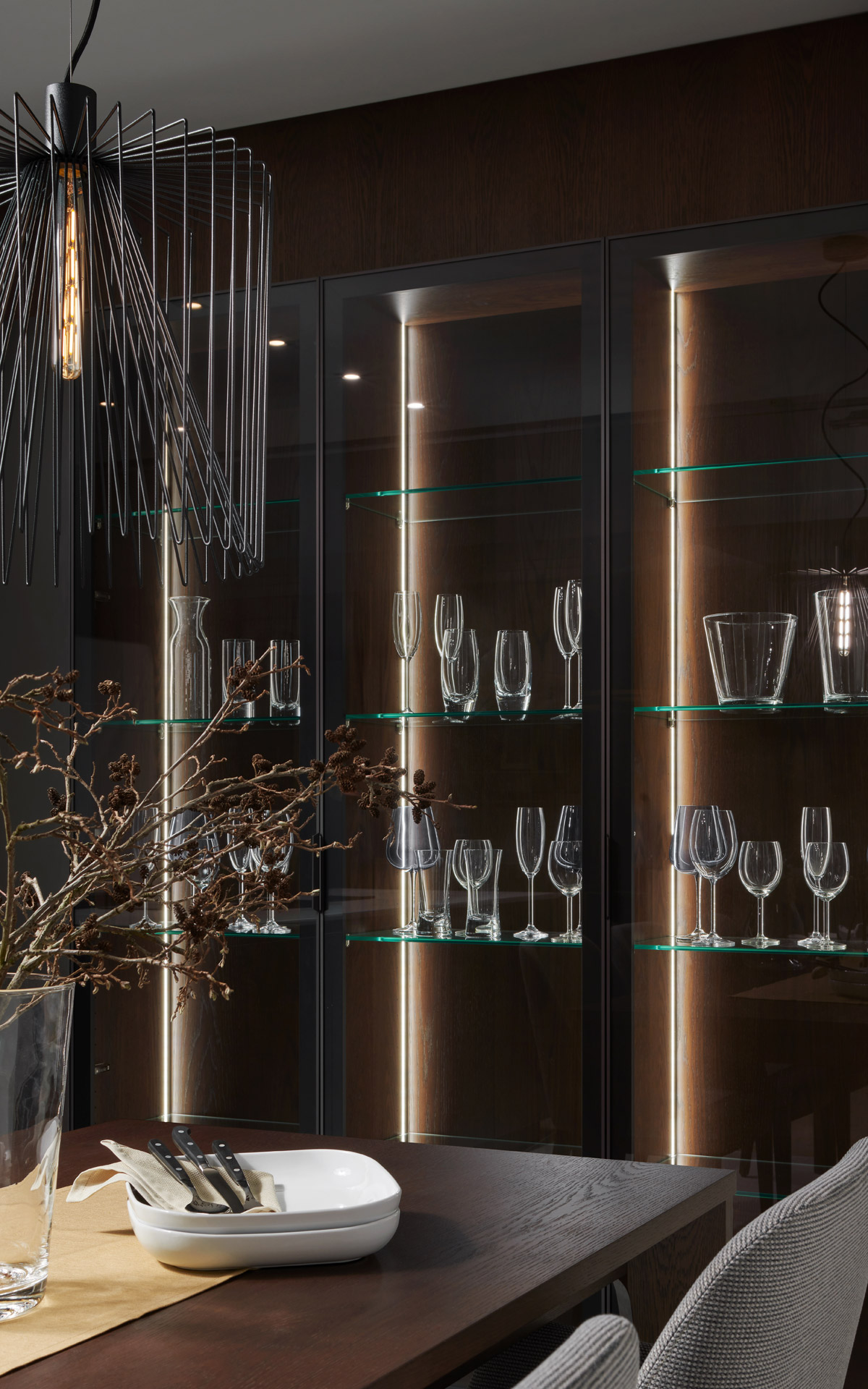 ve stejném provedení včetně jídelních židlí. Plné dveře v matném titanovém laku jsou odlehčeny prosklenou sestavou a decentní závěsnou kovovou konstrukcí pro police.