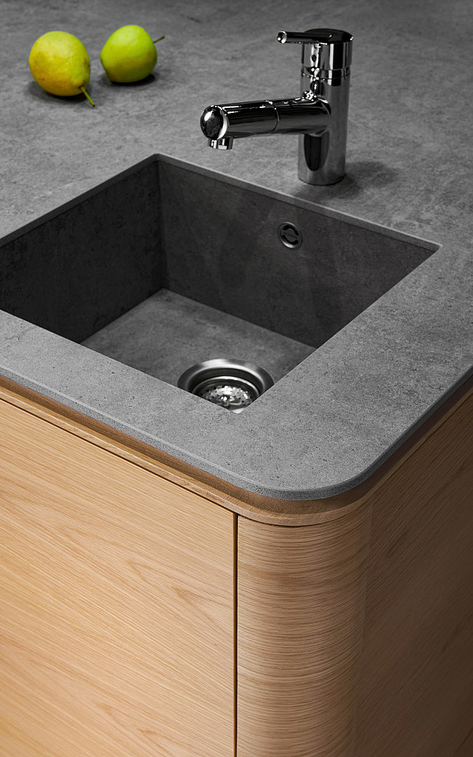 se zaoblenými prvky, jako středobod celé kuchyně. Koncové boky s rádiusem 80 vyrábíme v laku i v dýze.