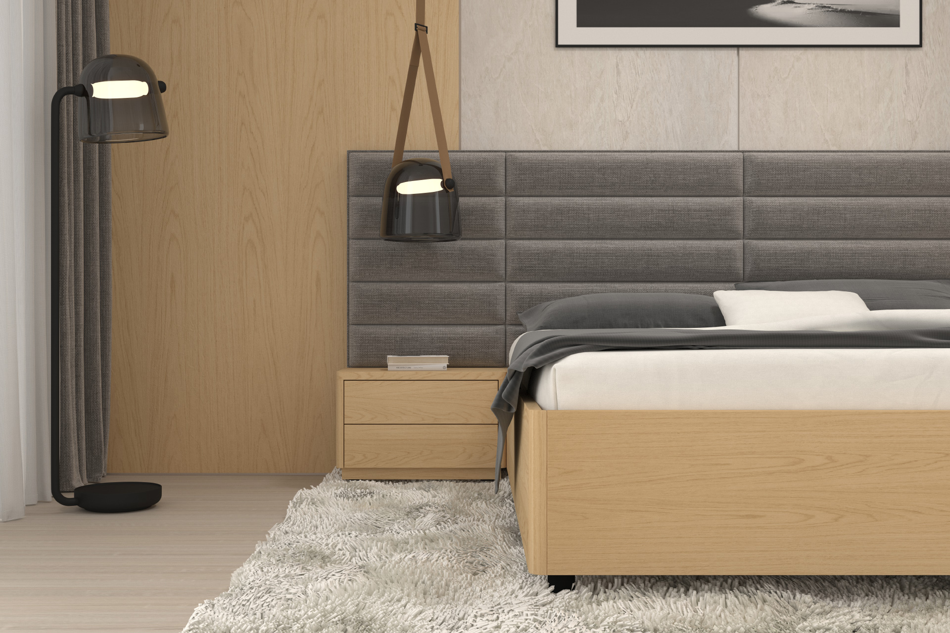 nočních stolků, rámu postele i prošití čela je sladěné do posledního detailu.