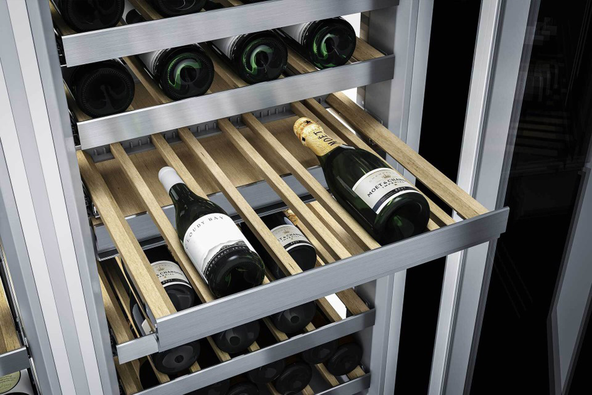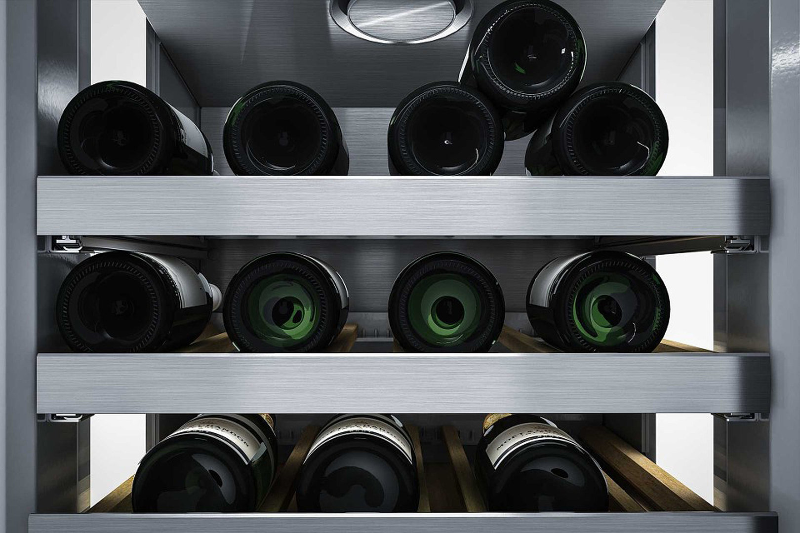 Flexibilní zásuvky umožňují přizpůsobení podle přání zákazníka i pro větší láhve vína a šampaňského. Uložíte tak všechny láhve své sbírky a plně využijete možnosti chladicí skříně na víno Monolith.