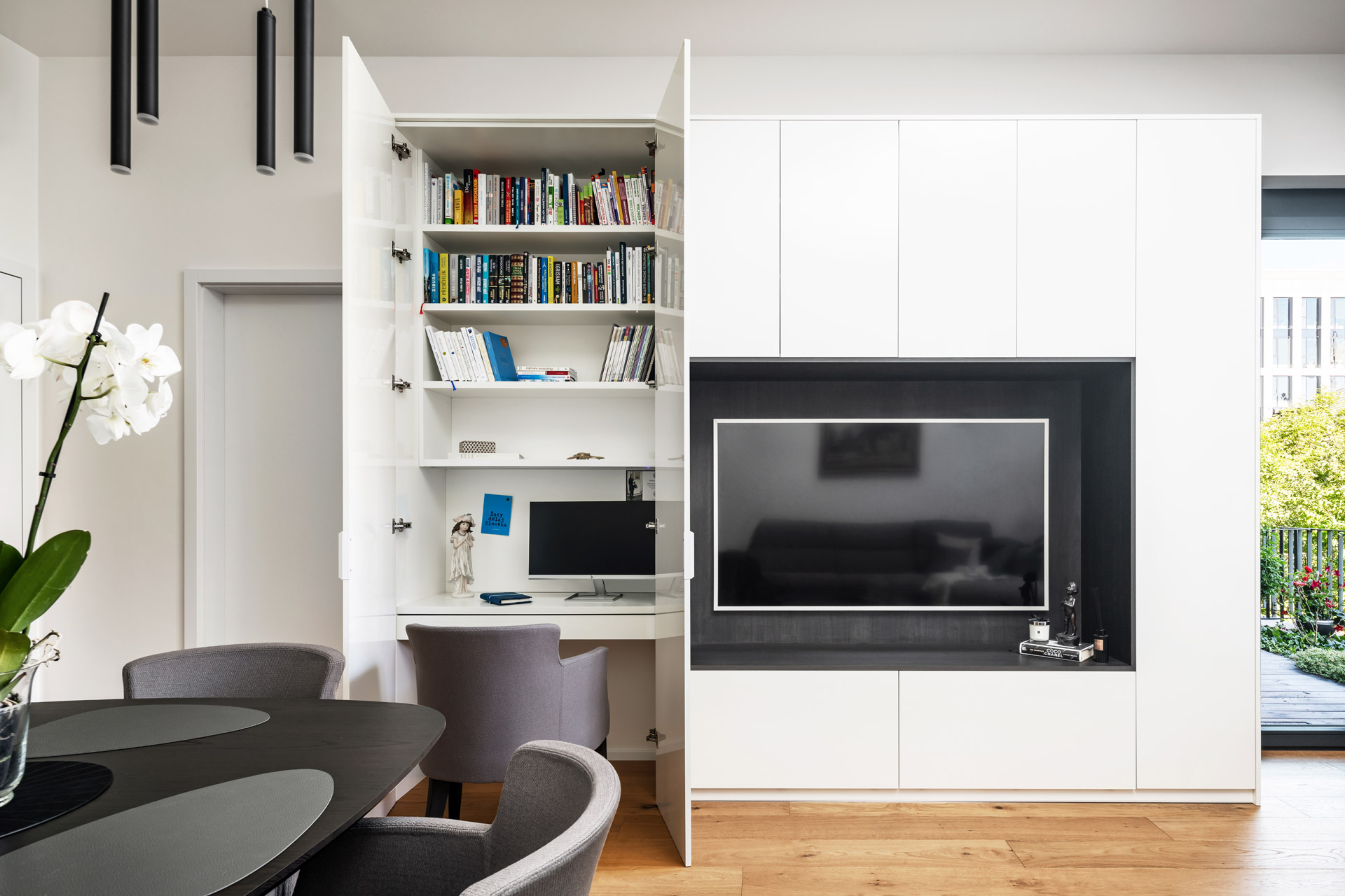 Interiér vybavený v jednotném materiálovém provedení, které se prolíná kuchyní, obývacím pokojem, ložnicí, koupelnu i chodbou. Nadčasový bílý lak ve vysokém lesku je nejlepší volbou v rámci menších interiérů. Přesvědčte se sami.
